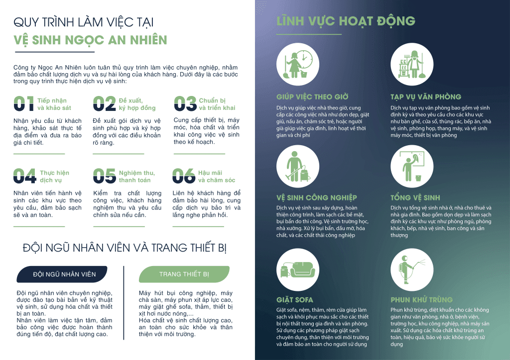 Chúng tôi, công ty TNHH Ngọc An Nhiên, tự hào là đơn vị chuyên nghiệp trong lĩnh vực vệ sinh công nghiệp và dịch vụ giúp việc gia đình. Với đội ngũ công nhân viên tay nghề cao, giàu kinh nghiệm trong dịch vụ vệ sinh và giúp việc, chúng tôi cam kết mang lại sự hài lòng tối đa cho Quý khách hàng bằng các dịch vụ chất lượng và hiệu quả.